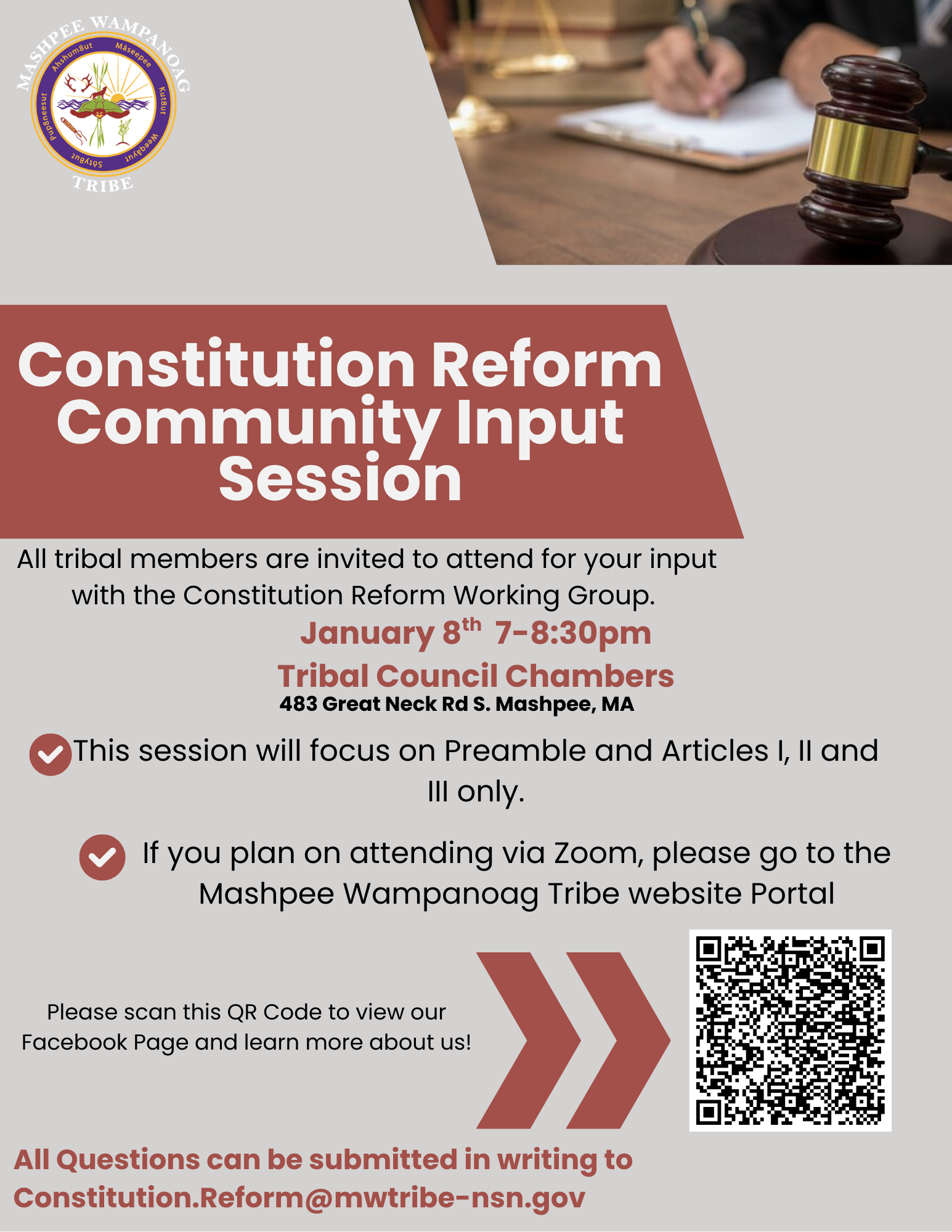 The Mashpee Wampanoag Tribe is inviting Tribal members to take part in an upcoming Constitution Reform Community Input Session, an important step in reviewing and updating the Tribe’s governing document to better reflect the needs, values, and realities of the Nation today.