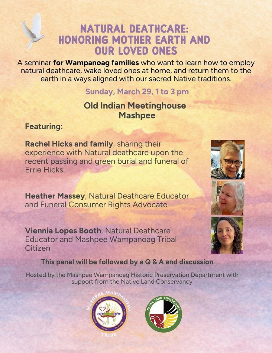 Wampanoag families are invited to a community seminar, “Natural Deathcare: Honoring Mother Earth and Our Loved Ones,” on Sunday, March 29, from 1:00–3:00 PM at the Old Indian Meetinghouse in Mashpee.