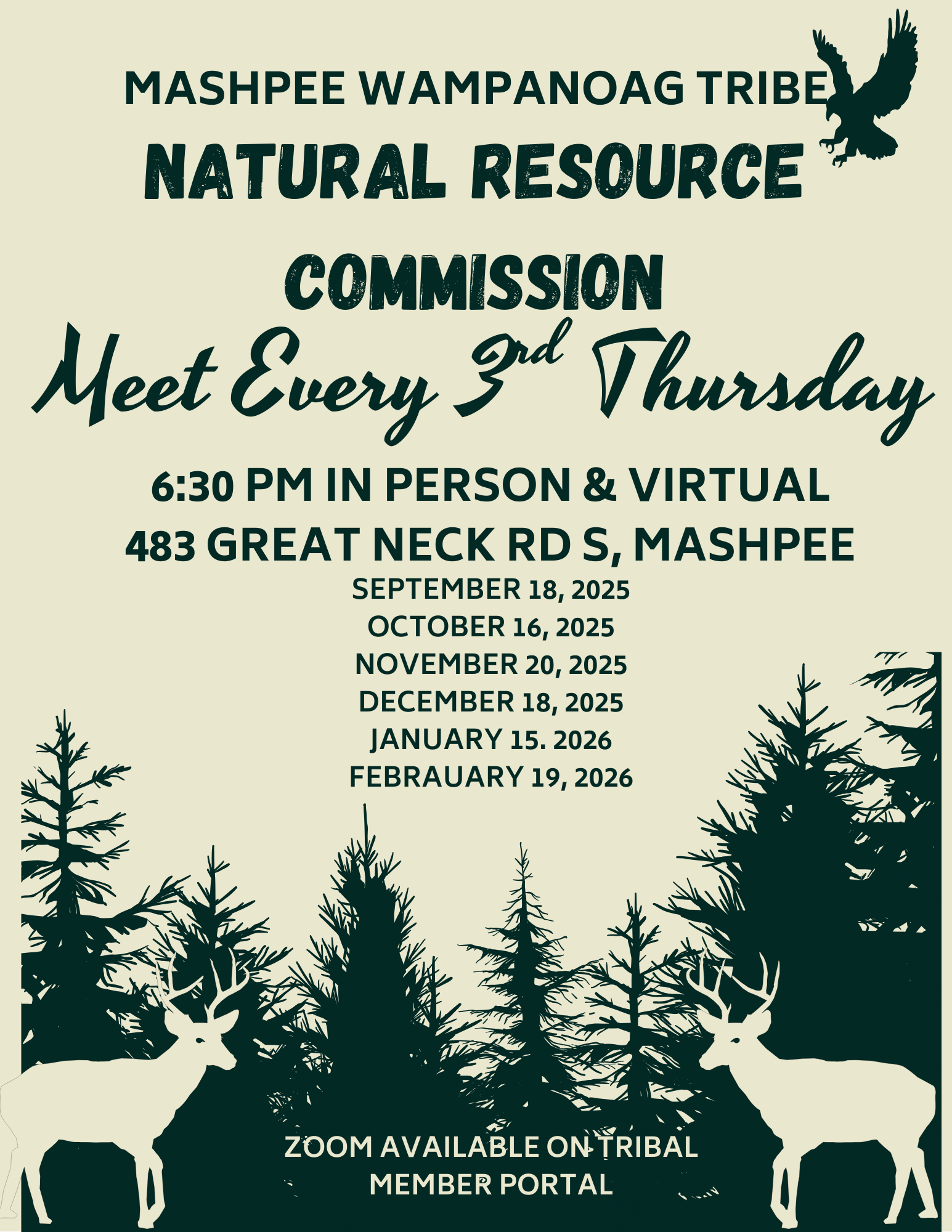 MWT Natural Resource Commission meetings are held on the third Thursday of every month at 6:30 PM. Tribal members may attend in person or via Zoom. The Zoom link can be found in the Tribal Member Portal .