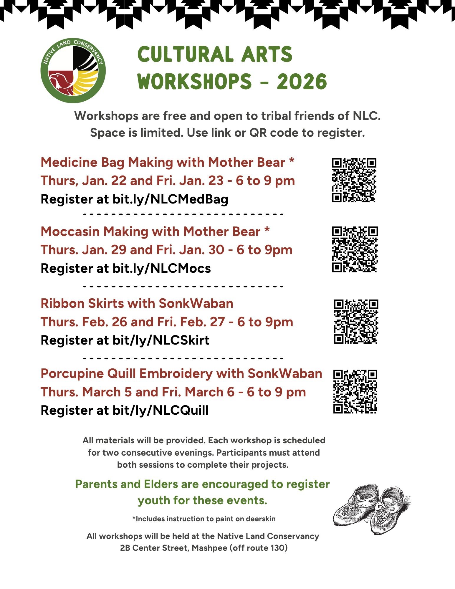 The Native Land Conservancy is offering a series of free Cultural Arts Workshops this winter, including medicine bag making, moccasin making, ribbon skirts, and porcupine quill embroidery. Workshops are open to Tribal friends of NLC, with all materials provided. Space is limited and advance registration is required. Parents and Elders are encouraged to register youth.