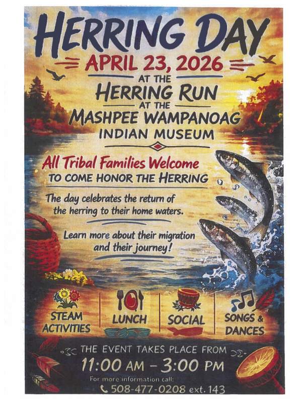 This year’s event will include STEAM activities, lunch, social time, and songs and dances, along with opportunities to learn more about the herring, their migration, and their journey. Herring Day is always a chance to gather, learn, and spend time together as a community, and all Tribal families are welcome. For more information, call 508-477-0208 ext. 143.