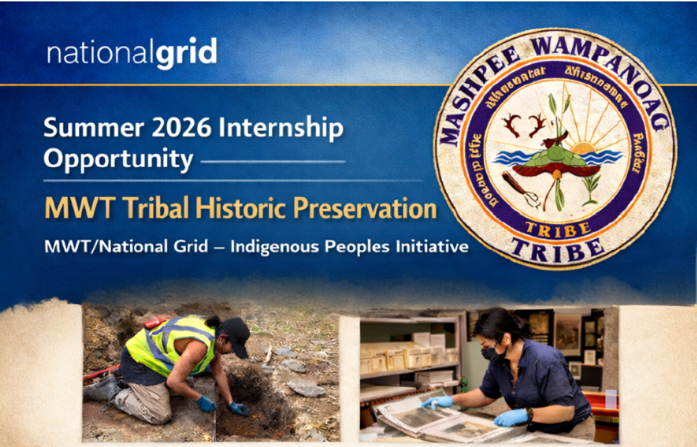The Mashpee Wampanoag Tribe is pleased to offer a paid Summer 2026 internship opportunity through its Tribal Historic Preservation Department (THPD), made possible with funding support from the National Grid – Indigenous Peoples Initiative (Pilot Program).